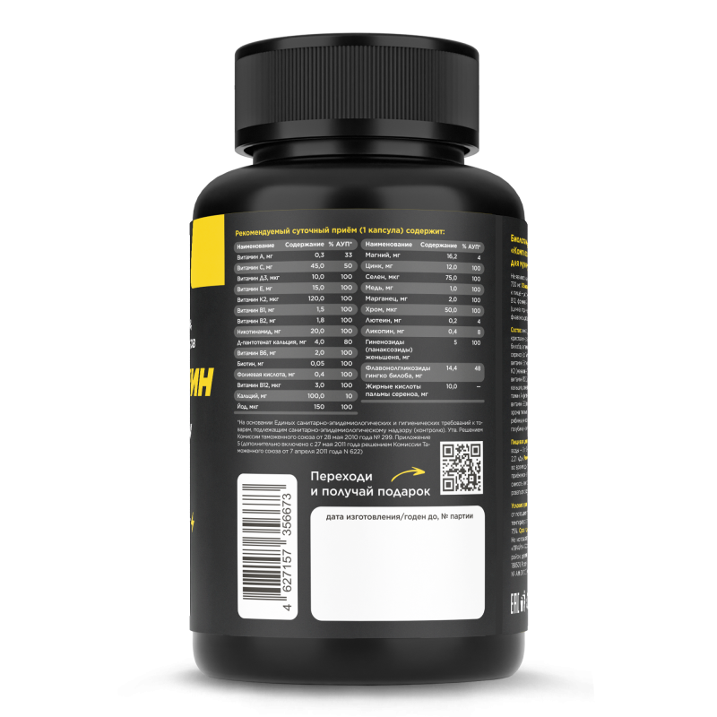 Состав: Желатин (капсула), кальция карбонат, экстракт чая зелёного,микрокристаллическая целлюлоза (наполнитель), магния цитрат, экстракт гингкобилоба, витамин С (аскорбиновая кислота), цинка лактат, экстракт пальмы сереноа(Пальметто), экстракт крапивы двудомной, экстракт семян тыквы, витамин Е (токоферолаацетат), экстракт женьшеня,никотинамид, витамин К2(менахинон), меди глюконат, магния стеарат (антислёживающий агент), витамин В12(цианкобаламин), витамин Д3(холекальциферол), пантотенат кальция, лютеин, ликопин, диоксид кремния(антислёживающий агент), витамин А (ретинолаацетат), витаминВ2(рибофлавин), марганца глюконат, витамин В6(пиридоксинагидрохлорид), витаминВ1(тиаминагидрохлорид), хромапиколинат, фолиевая кислота, селексен, йодат калия, биотин, экстракты: рябины, клюквы, семян грейпфрута, апельсина, ананаса, грейпфрута, черники, брусники, голубики, черной смородины, дикогоямса, моркови, капусты, брокколи.